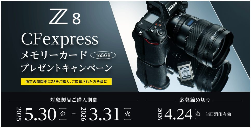 期間中に対象製品の「Z8」を購入のうえ、応募を完了させたユーザーに対して、165GB CFexpressメモリーカードをプレゼント。